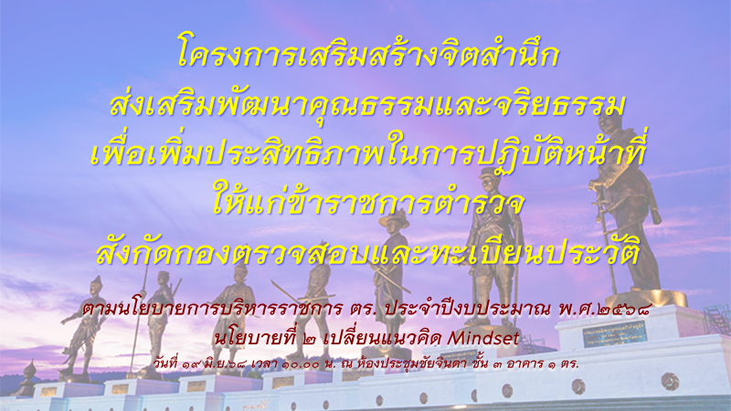 การดำเนินงานตามนโยบายเปลี่ยนแนวคิด Mindset “โครงการเสริมสร้างจิตสำนึก ส่งเสริมพัฒนาคุณธรรมและจริยธรรมเพื่อเพิ่มประสิทธิภาพ ในการปฏิบัติหน้าที่ให้แก่ข้าราชการตำรวจสังกัด ตป.” 19 มิถุนายน 2025 โดย police / ข่าวภารกิจผู้บังคับบัญชา ผบก.ตป. ประชุมชี้แจงให้ข้าราชการตำรวจในสังกัดตระหนักถึงพันธกิจสำคัญของ ตร. อันได้แก่ การถวายความปลอดภัยสำหรับองค์พระมหากษัตริย์และพระบรมวงศานุวงศ์ และให้ข้าราชการตำรวจในสังกัดรับชมวีดีทัศน์เผยแพร่พระเกียรติคุณและพระอัจฉริยภาพของสถาบันพระมหากษัตริย์ไทย เพี่อเสริมสร้างจิตสำนึกและน้อมรำลึกในพระมหากรุณาธิคุณอย่างหาที่สุดมิได้ของสถาบันพระมหากษัตริย์ไทย ณ ห้องประชุมชัยจินดา ชั้น 3 อาคาร 1 ตร.